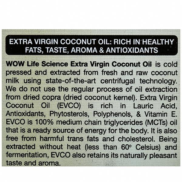 Product Information- Give your health benefit of antioxidant-rich WOW Life Science extra virgin coconut oil. Extra virgin coconut oil is known to have multiple restorative properties that help your overall health and wellness. It contains good cholesterol hdl and medium chain fatty acids that supports healthy heart and brain functions. The coconut oil, rich in fatty acids, vitamin e and has antioxidant properties, so it helps to keep skin and hair moisturised and nourished. Extra virgin coconut oil, being rich in Laurie acid, aids in keeping skin and scalp irritations at bay. Extra virgin coconut oil is 100% medium chain triglycerides (MCTs) oil that is a ready source of energy for the body. It is also free from harmful trans-fats and cholesterol. Since WOW Life Science extra virgin coconut oil is extracted without heating – temperatures are kept below 60 degree Celsius – It retains its naturally nutty taste and aroma.