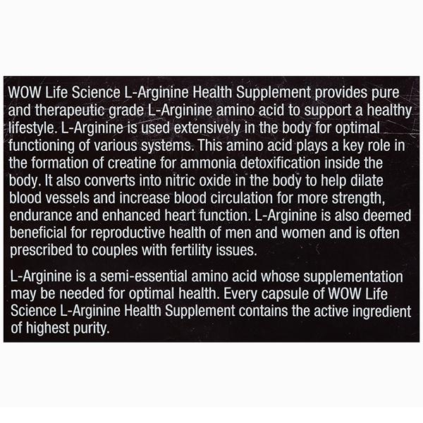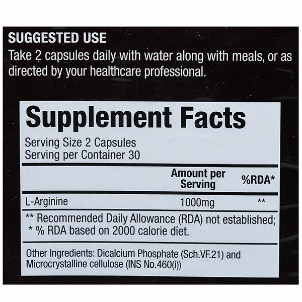 Product Information- L-arginine is a chemical building block of our body called an "amino acid." It is obtained from our diet and is necessary for our body to make proteins. It is used extensively in our body for ensuring the optimal functioning of various systems. L-arginine gets converted into nitric oxide inside the body. Nitric oxide causes blood vessels to open wider for improved blood flow and better circulation contributes to improved overall health.