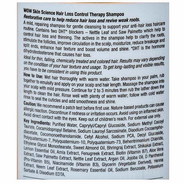 WOW Skin Science Hair Loss Control Therapy Shampoo has a powerful anti-hair loss action that effectively reduces hair fall by naturally blocking the DHT hormone, proven by research to be responsible for hair loss. This shampoo’s twice as powerful formulation contains the very best of Ayurvedic Herbal Extracts – Bhringraj (King of Herbs), Amla, Neem, Henna, Shikakai and Lemon – and Western Herbal Extracts – Biotin, Rosemary, Saw Palmetto and Niacin – for an effective action that doesn’t just stop at blocking DHT and reducing hair fall. Its potent pro-hair bioactive ingredients also promote hair growth and improve hair volume. Try it today; this shampoo is the ultimate Hair Loss Control Therapy with multiple hair benefits.