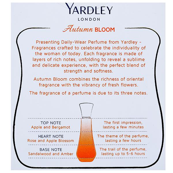 Yardley London Autumn Bloom Refreshing Body Spray combines the richness of oriental notes with the vibrancy of fresh flowers to keep you refreshed and pleasantly fragrant throughout the day.
