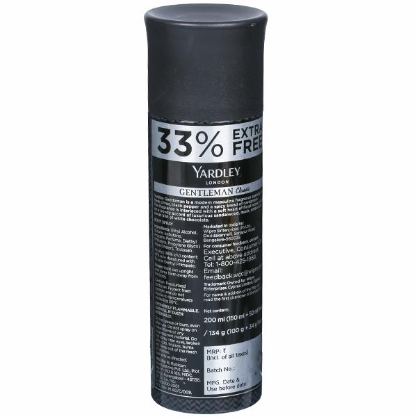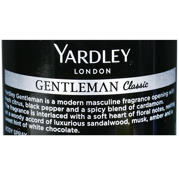 Yardley London Gentleman For Men Classic Body Spray as a mild and spicy fragrance best suited for modern gentlemen with traditional values. This woody yet spicy scent is sure to be a winning addition to your grooming regime.