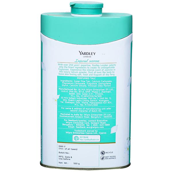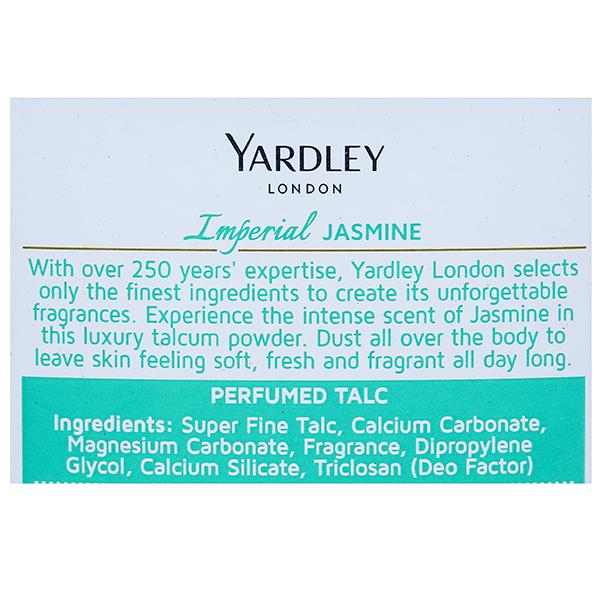 A luxurious talc that truly pampers - Yardley London's Imperial Jasmine Perfumed Talc is all about keeping you lightly fragrant. Complementing your natural scent, it ensures long-lasting freshness thanks to a light floral heart of jasmine and hyacinth, and spicy base notes of musk.