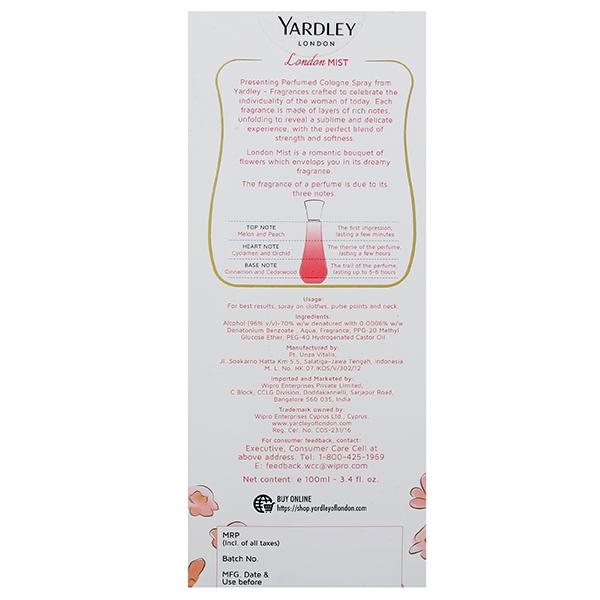 Product Information - London Mist is a romantic bouquet of flowers which envelops you in its dreamy fragrance. Experience the scent of fresh flowers from the english countryside in every spray. Energizing and rejuvenating, london mist Eau de cologne gives you a refreshing feel.Yardley London prides itself in crafting authentic, rich and iconic english fragrances. In every whiff of Yardley London women’s range, you can hear whispers of the lush english gardens. The house of Yardley specializes in classic, single note scents and trend led floral bouquets to give you a scent of the english luxury.