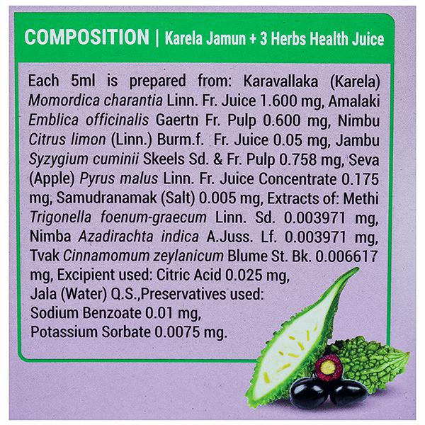 Karavallaka (Karela) momordica charantia linn. Fr. juice 1.600 mg, amalaki emblica officinalis gaertn. Fr. pulp 0.600 mg, nimbu citrus limon (linn.) burm.f. Fr. juice 0.05 mg, Jambu syzygium cuminii skeels Sd. & Fr. pulp 0.758 mg, seva (Apple) Pyrus malus linn. Fr. juice concentrate 0.175 mg, samudranamak (salt) 0.005 mg, extracts of: Methi trigonella foenum-graecum linn. Sd. 0.003971 mg, nimba azadirachta indica A.juss. lf. 0.003971 mg, Tvak cinnamomum zeylanicum blume st. bk. 0.006617 mg, excipient used: citric acid 0.025 mg, Jala (water) Q.S. preservatives used: Sodium Benzoate 0.01 mg, Potassium sorbate - 0.0075 mg.