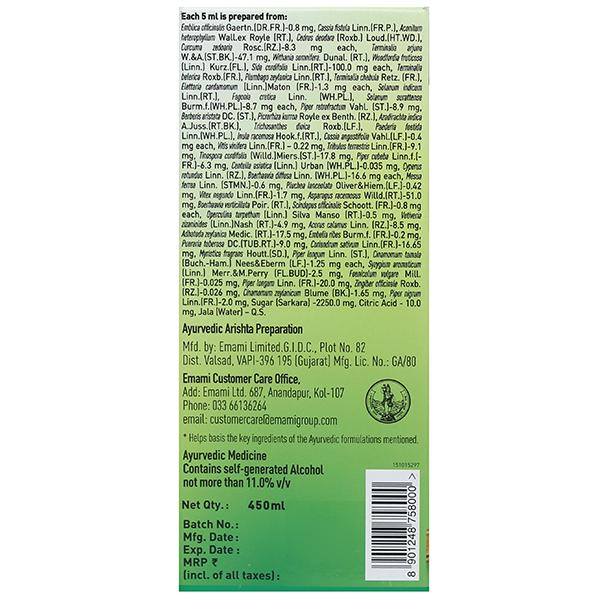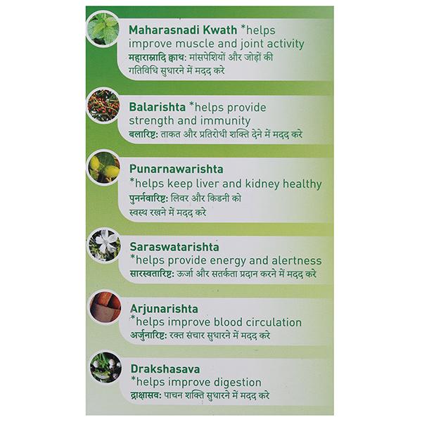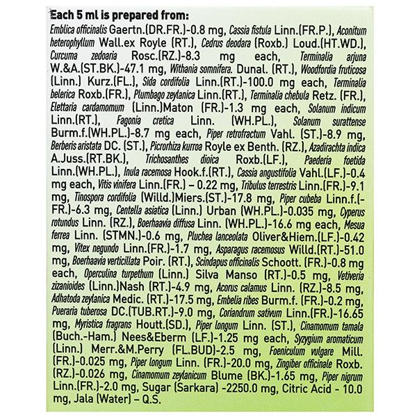 Emblica officinalis Gaertn. (DR.FR.) - 0.8 mg, Cassia Fistula Linn. (FR.P.), Aconitum heterophyllum Wall.ex Royle (RT.), Cedrus deodara (Roxb.) Loud. (HT.WD.), Curcuma zedoaria Rosc. (RZ.) - 8.3 mg each, Terminalia arjuna W.&A. (ST.BK.) - 47.1 mg, withania somnifera. Dunal. (RT.), Woodfordia fruticosa (Linn.) Kurz. (FL.), Sida cordifolia Linn. (RT.) - 100.0 mg each, Terminalia belerica Roxb. (FR.), Plumbago Zeylanica Linn (RT.), Terminalia chebula Retz. (FR.), Elettaria cardamomum (Linn.), Maton (FR.) - 1.3 mg each, Solanum indicum Linn. (RT.) Fagonia cretica Linn. (WH.Pl.), Solanum surattense Burm.f. (WH.PL.) - 8.7 mg each, Piper retrofractrum Vahl. (ST.) - 8.9 mg, Berberis aristata DC. (ST.), Picrorhiza kurroa Royle ex Benth. (RZ.), Azadirachta indica A. Juss. (RT.BK.), Trichosanthes dioica Roxb. (LF.), Paederia foetida Linn. (WH.Pl.), Inula racemosa Hook.f.(RT.), Cassia angustifolia Vahl. (LF.) - 0.4 mg each, Vitis vinifera Linn. (FR.) - 0.22 mg, Tribulus terrestris Linn. (FR.) - 9.1 mg, Tinospora cordifolia (Willd.) Miers. (ST.) - 17.8 mg, Piper cubeba Linn.f.(-FR.) - 6.3 mg, Centella asiatica (Linn,), Urban (WH.Pl.) - 0.035 mg, Cyperus rotundus Linn. (RZ.), Boerhaavia diffusa Linn. (WH.PL.) - 16.6 mg each, Mesua ferrea Linn. (STMN.) 0.6 mg, Pluchea Ianceolata Oliver & Hiem. (LF.) - 0.42 mg, Vitex negundo Linn. (FR.) - 1.7 mg, Asparagus racemosus Willd. (RT.) - 51.0 mg, Boerhaavia verticillata Poir. (RT.), Scindapus officinalis Schoott. (FR.) - 0.8 mg each, Operculina tupethum (Linn.), Silva manso (RT.) - 0.5 mg, Vetiveria zizanioides (Linn.), Nash (RT.) - 4.9 mg, Acorus calamus Linn. (RZ.) - 8.5 mg, Adhatoda zeylanica Medic. (RT.) - 17.5 mg, Embelia ribes Burm.f. (FR.) - 0.2 mg, Pueraria tuberosa DC. (TUB.RT.) - 9.0 mg, Coriandrum sativum Linn. (FR.) - 16.65 mg, Myristica fragrans Houtt. (SD.), Piper longum Linn. (ST.), Cinnamomum tamala (Buch.-Ham.) Nees & Eberm (LF.) - 1.25 mg each, Syzygium aromaticum (Linn.) Merr. & M.Perry (FL.BUD) - 2.5 mg, Foeniculum vulgare Mill. (FR.) - 0.025 mg, Piper Longum Linn. (FR.) - 20.0 mg, Zingiber officinale Roxb. (RZ.) - 0.026 mg, cinnamomum zeylanicum Blume (BK.) - 1.65 mg, Piper nigrum Linn. (FR.) - 2.0 mg, Sugar (Sarkara) - 2250.0 mg, Citric acid - 10.0 mg, Jala (Water) - QS